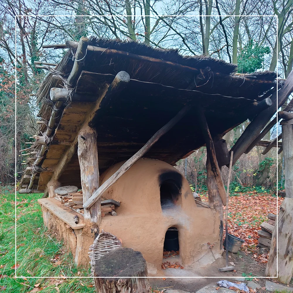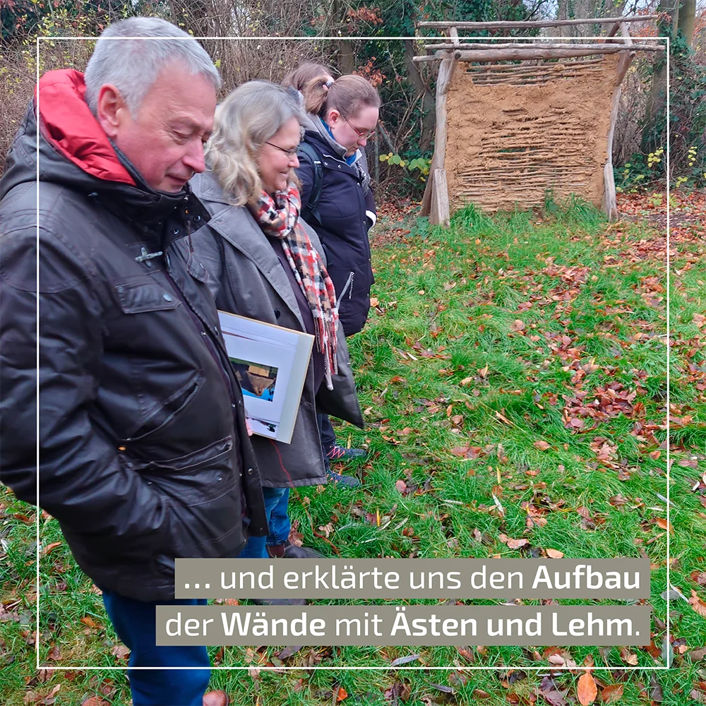 Dr. Nicole Kegler-Graiewski stellte uns die verschiedenen Gebäude vor und gab uns einen umfassenden Einblick, wie diese nach Vorbild der archäologischen Befunde aus dem Oberlauf des Köhmbachs bei Garzweiler rekonstruiert wurden. In Titz werden so Erkenntnisse zu Baumethoden, Haltbarkeit und Alltagserfahrungen eisenzeitlichen Wohnens gesammelt – Von der Art Dächer mit Reet oder Stroh zu decken, über die Bekämpfung von in den Baustoffen lebenden Schädlingen bis zum Kochversuche im ‚Pizzaofen‘ aus Lehm oder einer Erdgrube.