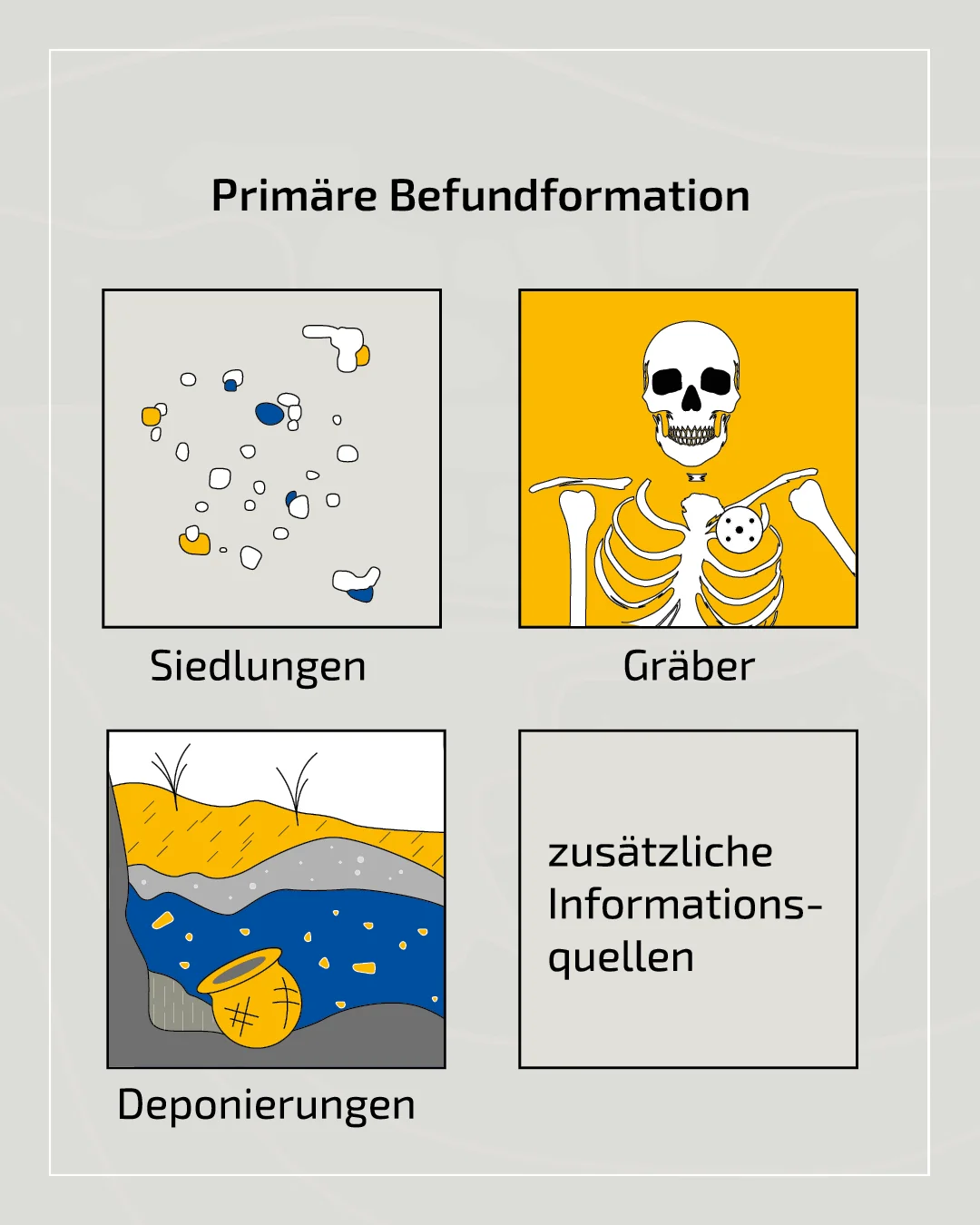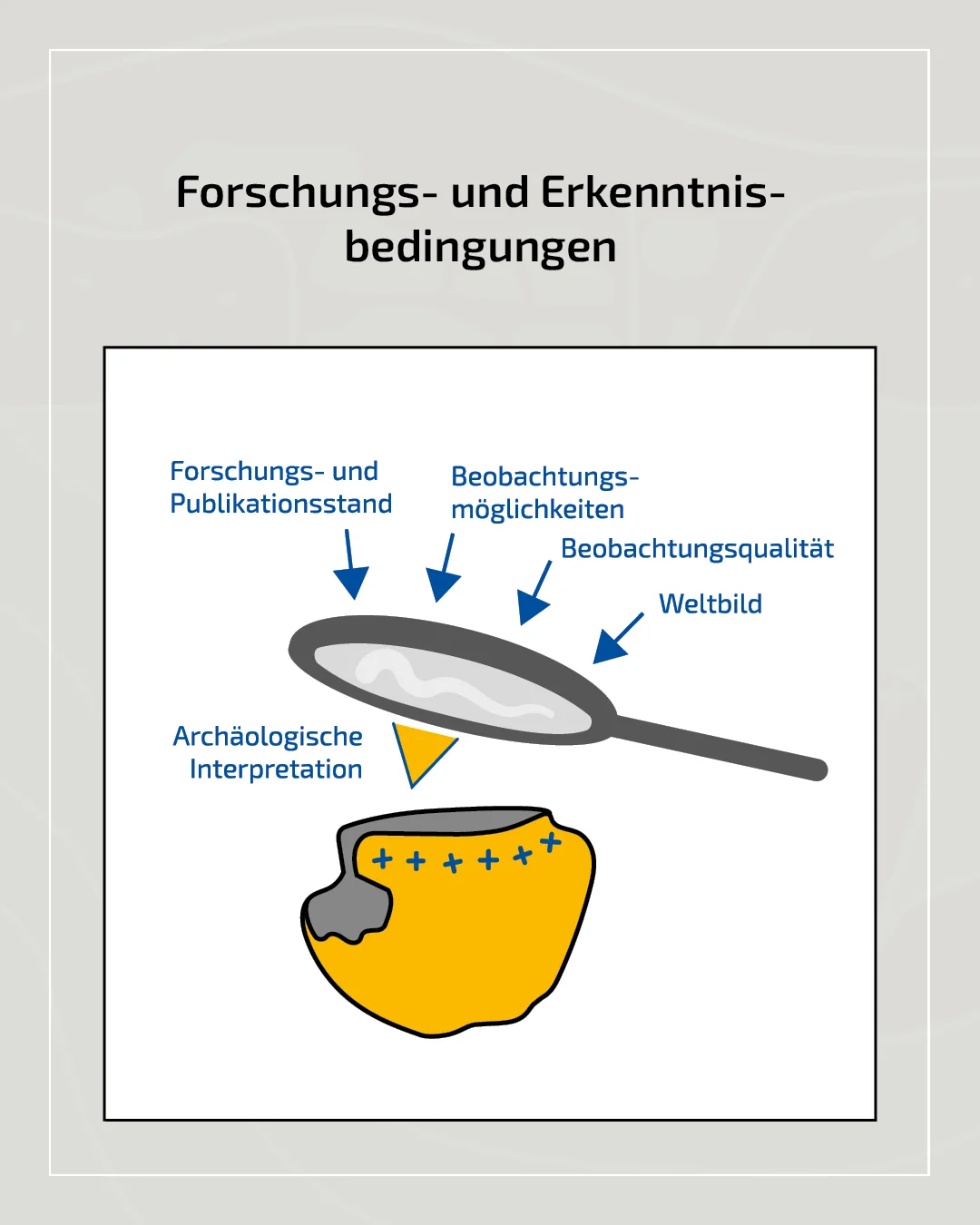 Aus dem archäologischen Potenzial (primäre und sekundäre Befundformation) erfolgt die wissenschaftliche Erschließung von Quellen, die wiederum von verschiedenen Faktoren beeinflusst werden kann: