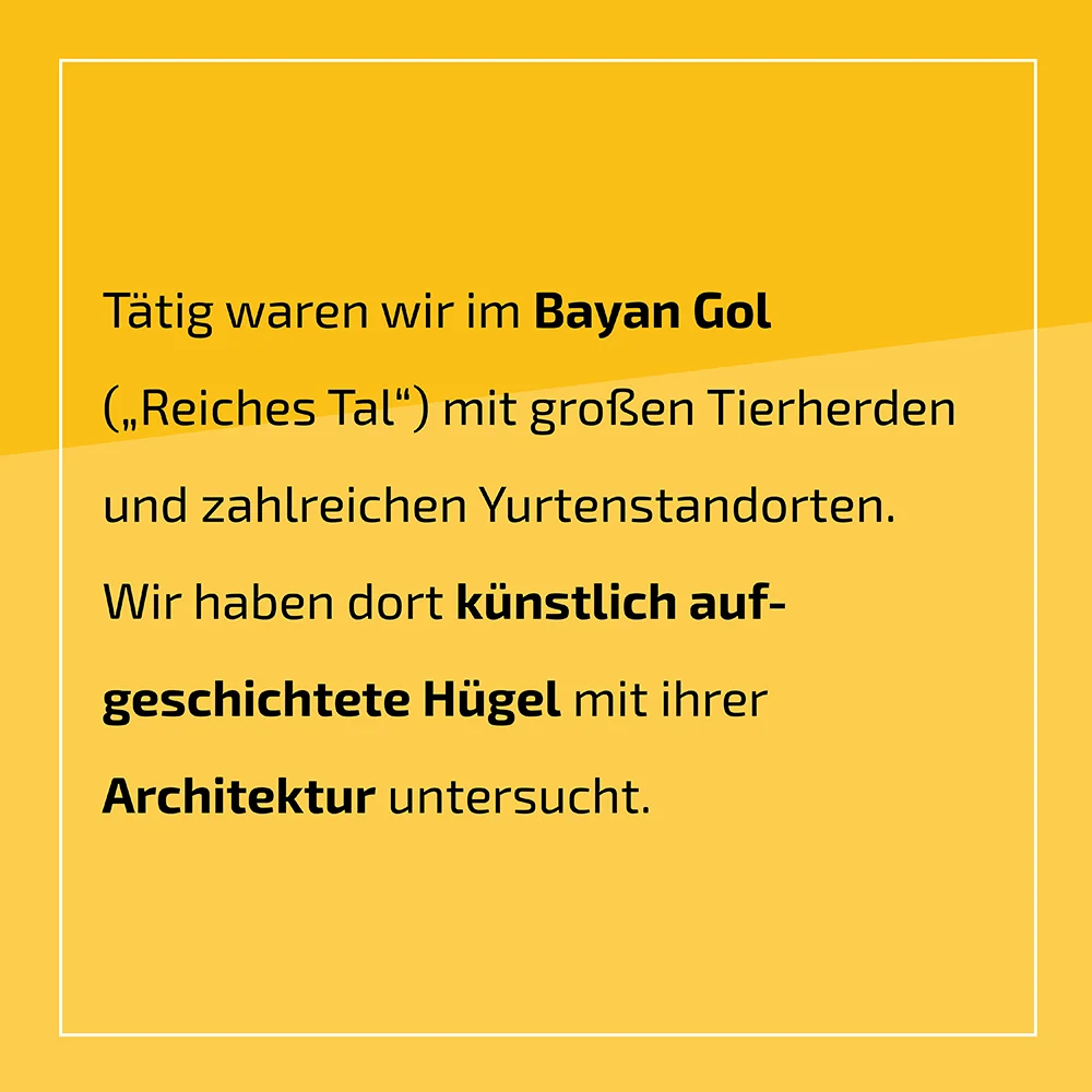 Die zweite diesjährige Mongolei-Kampagne führte uns ins Bayan Gol ("Reiches Tal"), das in einem Seitental des Orkhon, ca. 14 km Luftlinie von der ehemaligen mongolischen Hauptstadt Karakorum entfernt, liegt. Dort untersuchten wir unter anderem künstlich aufgeschichtete Hügel und ihre Architektur.