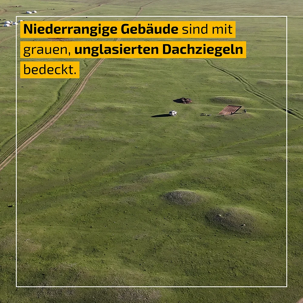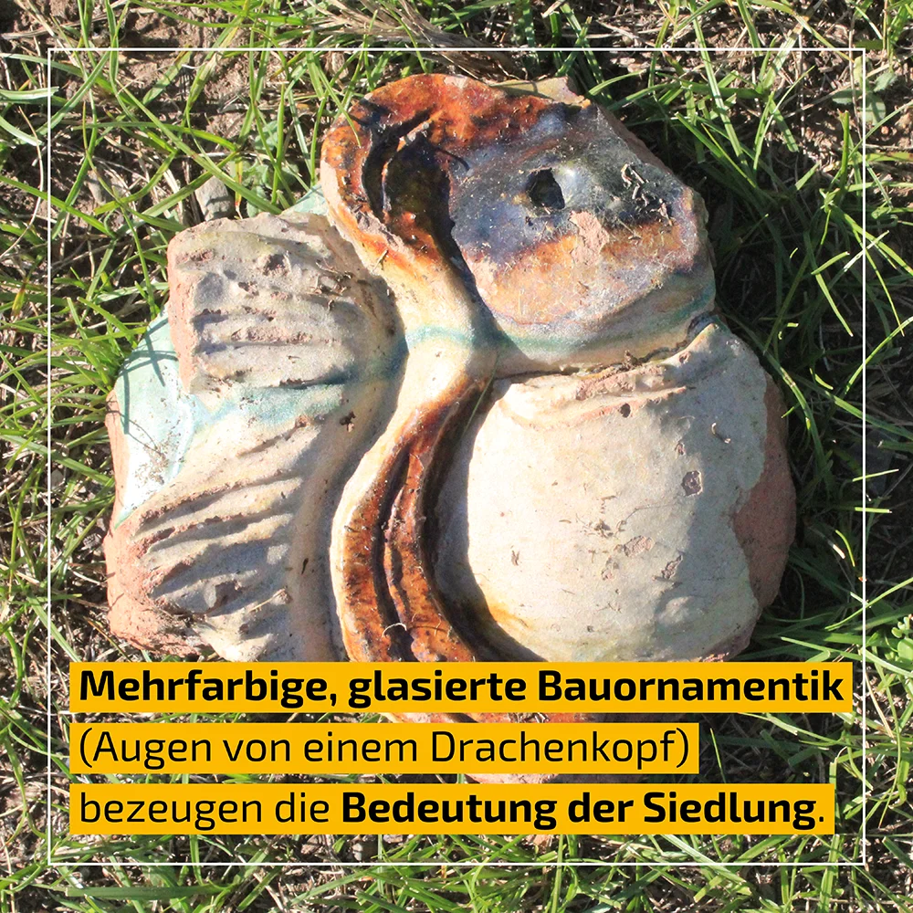 Der Nachweis mehrfarbiger, glasierter Bauornamentik (Augen von einem Drachenkopf) bezeugt die Bedeutung der Siedlung. Die sog. Drachenköpfe sitzen auf dem First von Gebäuden. Je mehr Farben für die Glasur verwendet wurden, desto höher ist die Bedeutung des Gebäudes einzuschätzen. Gelb bzw. Gold wird beispielsweise genutzt, um Bauten zu kennzeichnen, die auf Anweisung des Herrschers errichtet wurden. Niederrangige Gebäude sind mit grauen, unglasierten Dachziegeln bedeckt. Die Podeste verteilen sich an beiden Seiten des kleinen, kräftig mäandrierenden Baches.