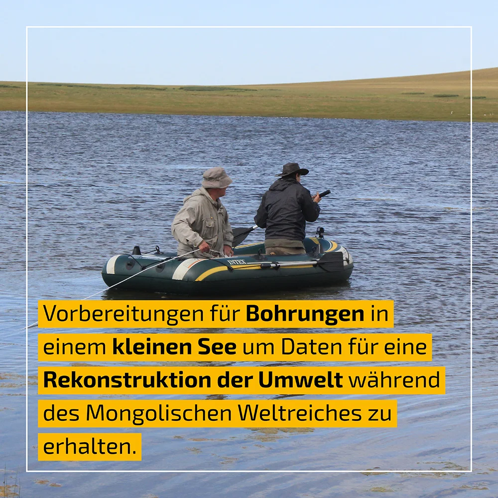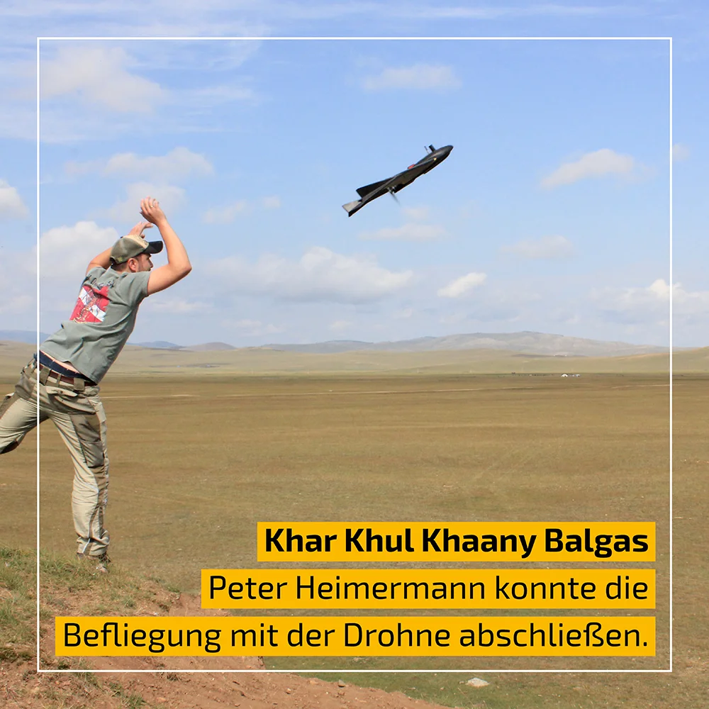 Für kurze Zeit waren wir auch in der Nähe der ins 13. Jahrhundert datierten Stadt Khar Khul Khaany Balgas tätig. Peter Heimermann konnte die Befliegung des Geländes mit der Drohne abschließen. Thomas Litt und Finn Oejen führten Bohrungen in einem kleinen See durch, um Daten für eine Rekonstruktion der Umwelt während des Mongolischen Weltreiches zu erhalten.