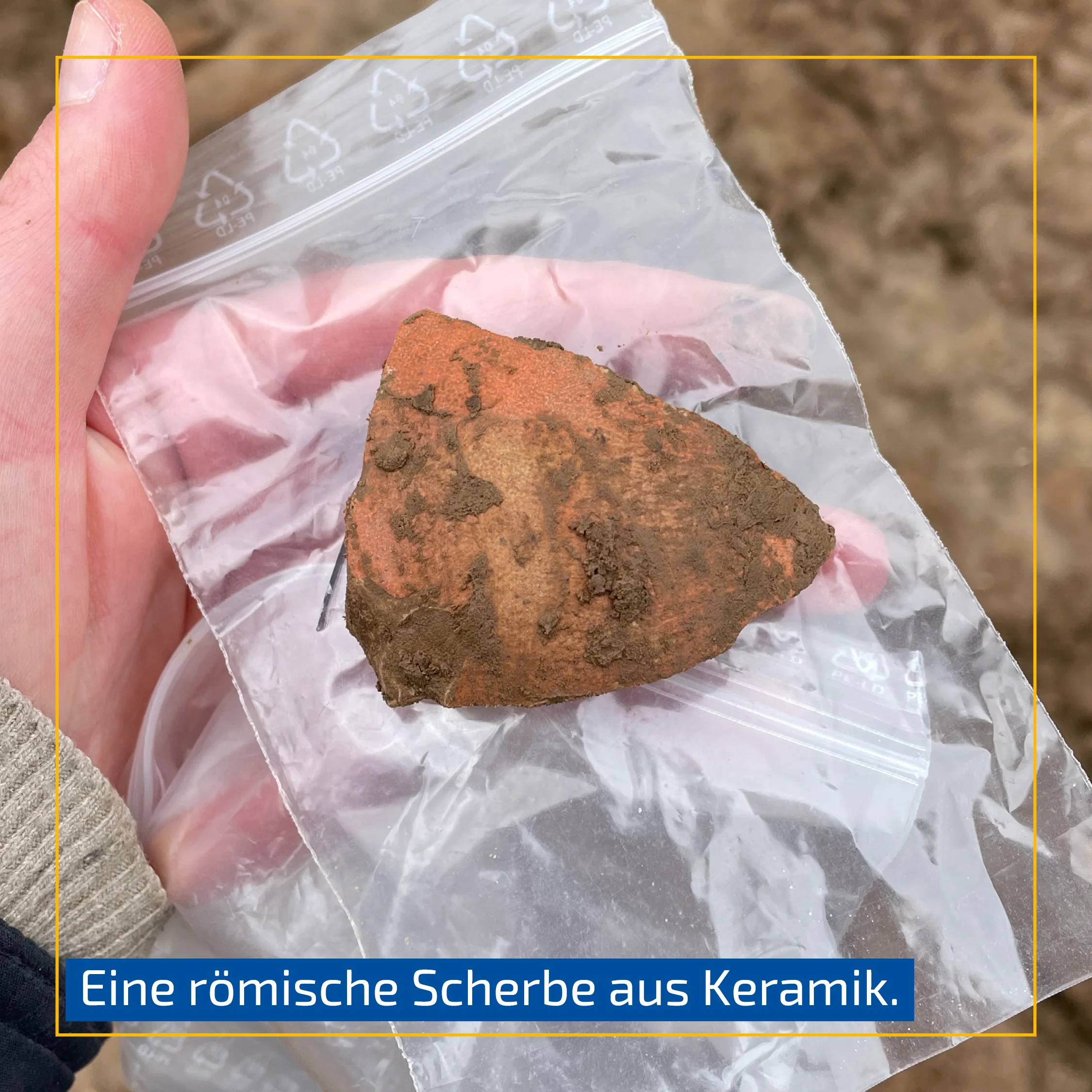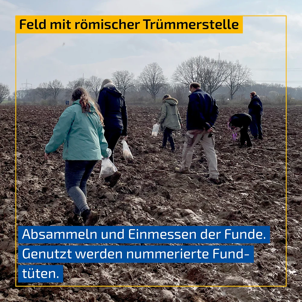 In einem ersten Schritt wurden auf den angrenzenden Ackerflächen Feldbegehungen mit einer Gruppe von 20 Studierenden durchgeführt und unter anderem eine römerzeitliche Trümmerstelle lokalisiert.