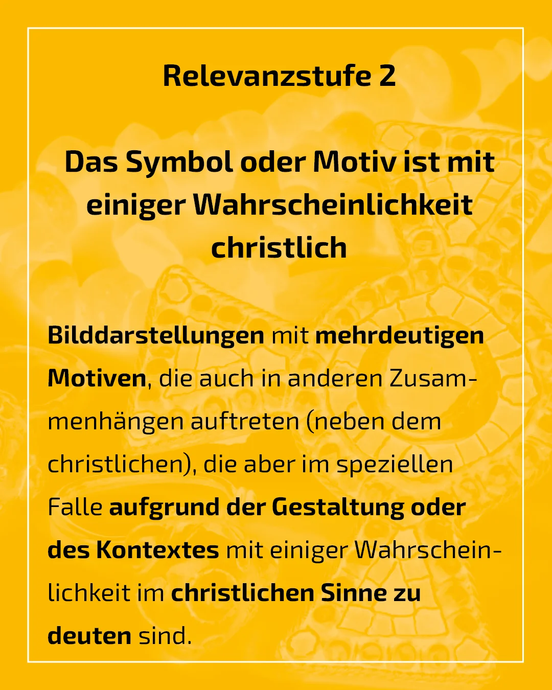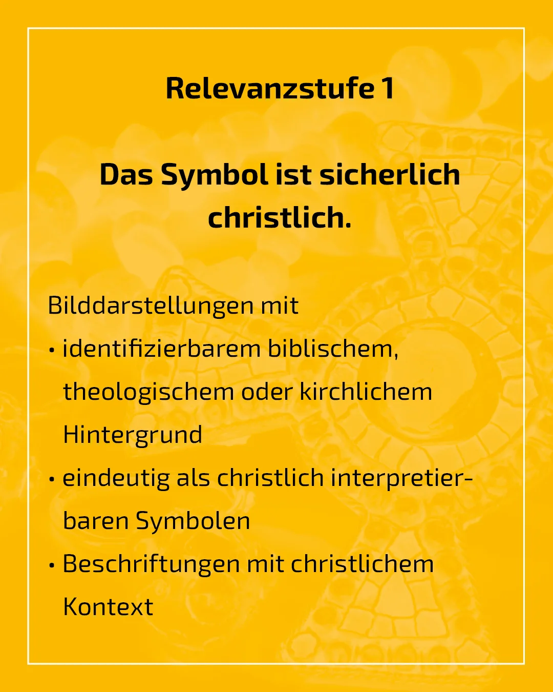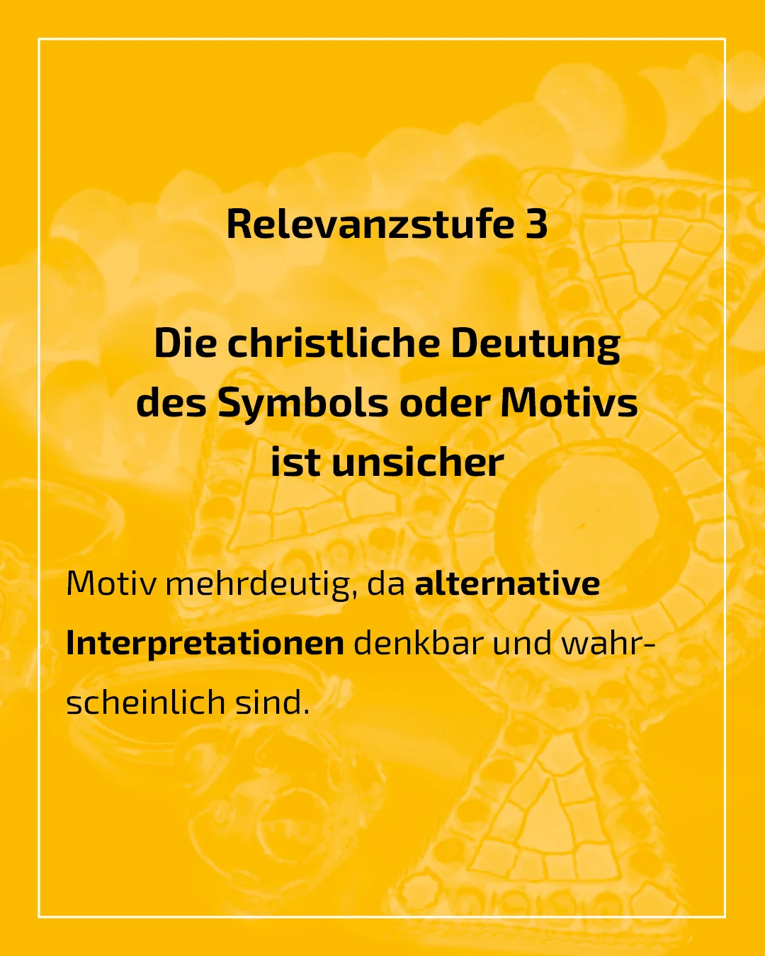 Die Zahl eindeutig christlicher Symbole, z.B. Christogramm, wird als gering eingestuft. Potenziell christliche Symbole, wie florale Motive, Kreuze, Menschen- und Tierdarstellungen, müssen in ihrem spezifischen Kontext betrachtet werden. Auch, da das Christentum im Laufe seiner Geschichte Motive anderer Kulturen übernommen hat. Selbst eindeutig christliche Elemente weisen deren Träger*innen nicht zwangsläufig gesichert als Christ*in aus, sondern lassen eher Rückschlüsse auf die Bestattungsgemeinschaft zu.