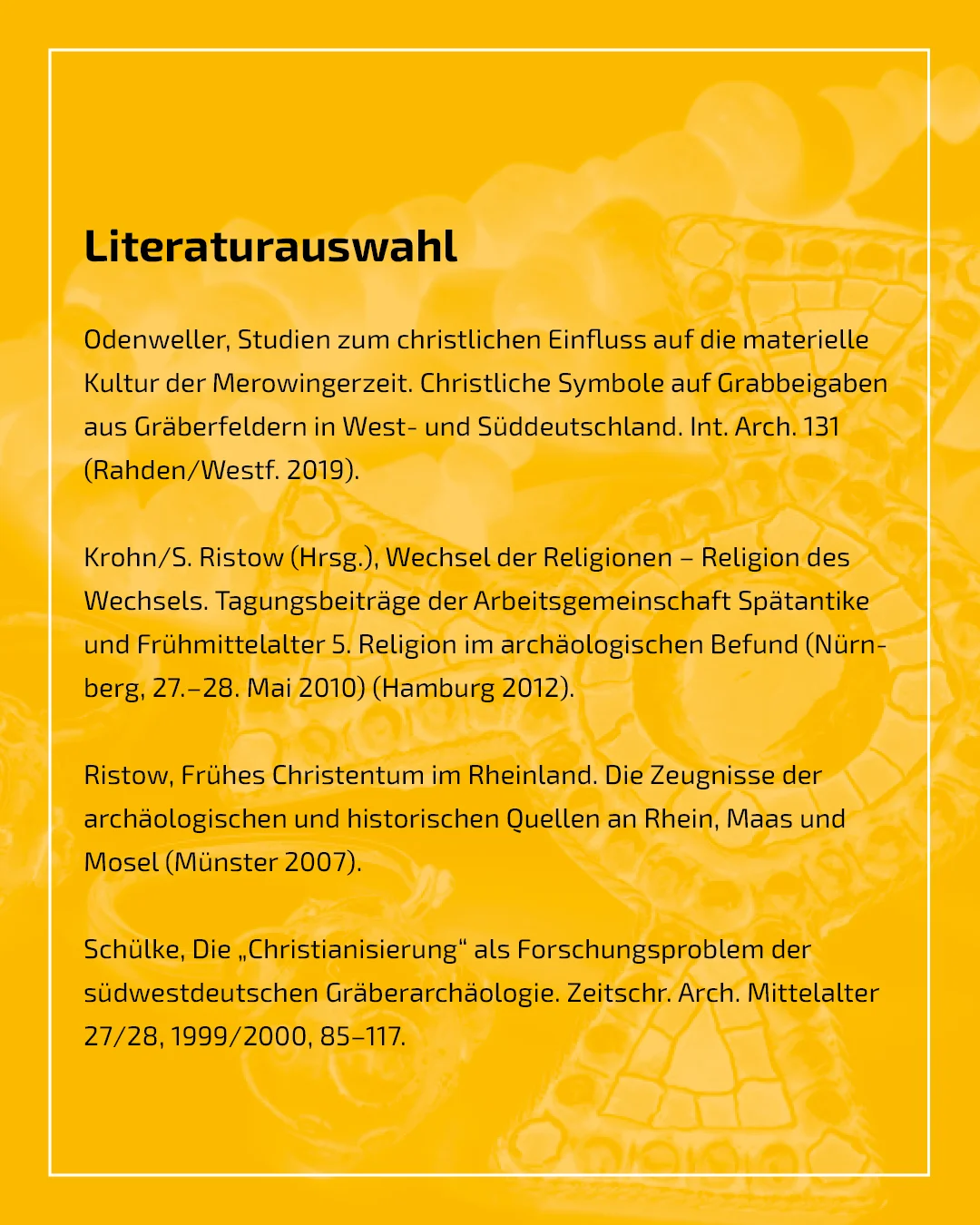 In einer Untersuchung von 484 Grabbefunden wiesen <10% potentiell christlich beeinflusste Beigaben auf (Odenweller 2019). Ihre Verteilung auf Männer- und Frauengräber des 6. Jh. war maßgeblich von der Fundüberlieferung geprägt: Als Bildträger der Symbole wurden primär am Körper getragene Metallgegenstände und nicht etwa Keramik verwendet. In der Stichprobe waren im 6. Jh. mehr Frauen- als Männergräber vertreten. Im Untersuchungsgebiet enthielten Frauengräber zu dieser Zeit mehr Metallobjekte als Männergräber. Hieraus ergab sich eine scheinbare Bevorzugung christlicher Symbolik als Beigabe in Frauengräbern.