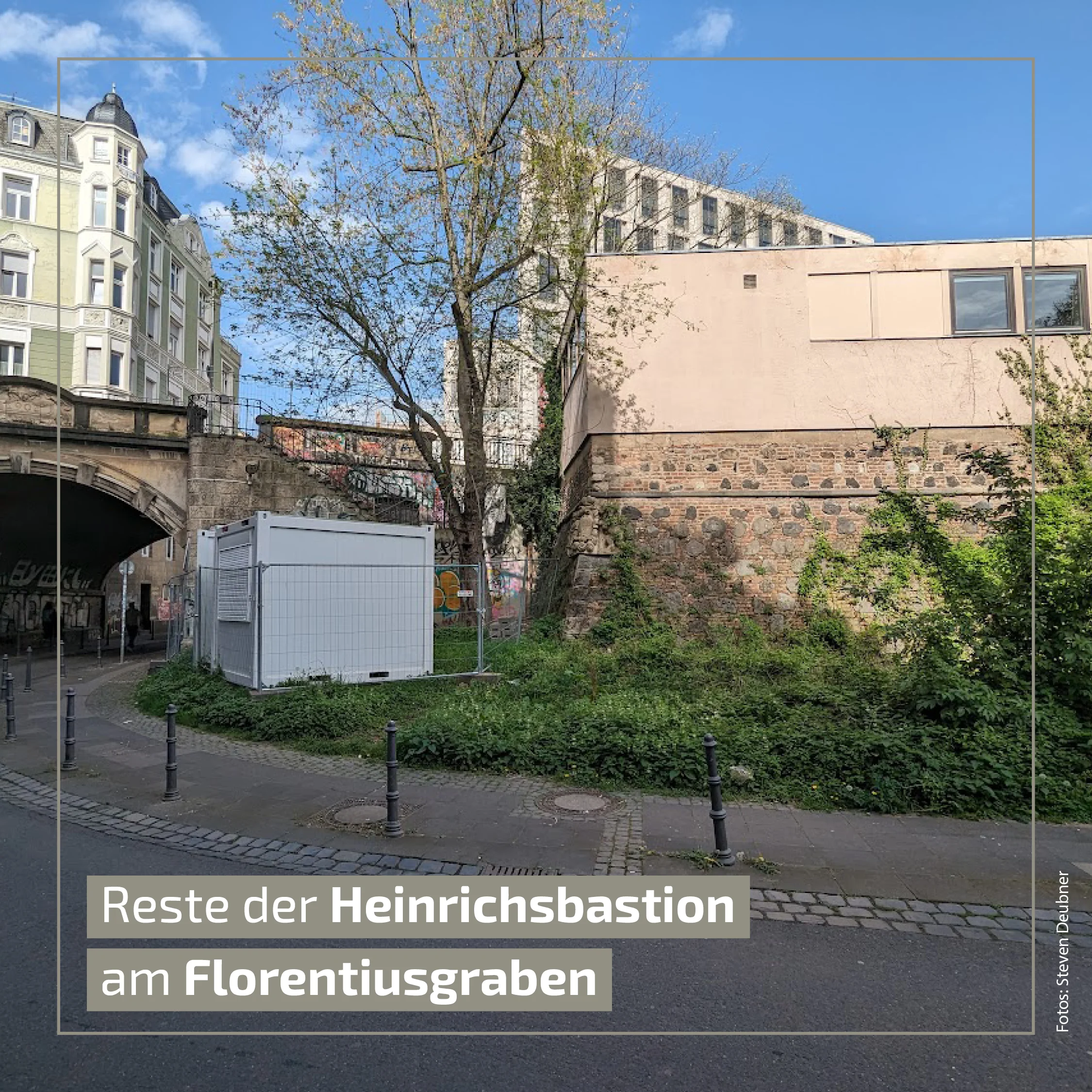 Begibt man sich auf den Spielplatz südlich des Sparkassengebäudes und wirft einen Blick jenseits des westlich gelegenen Geländers, fällt der vertiefte Florentiusgraben auf. In der frühen Neuzeit war er der Heinrichsbastion vorgelagert, heute folgt ihm der moderne Straßenverlauf. Steigt man die Treppe an der Brücke auf der Budapester Straße zum Florentiusgraben hinunter, kann man die erhaltenen Reste der Bastion besichtigen. Sie wurde nach dem Kölner Kurfürsten Maximilian Heinrich von Bayern benannt und zwischen 1658 und 1664 n. Chr. im Rahmen der Erweiterung der Bonner Stadtbefestigung als Ergänzung zur mittelalterlichen Stadtmauer errichtet. Dem Bau des Sparkassengebäudes vorgreifende archäologische Untersuchungen ermöglichten 2011 eine detaillierte Rekonstruktion der Heinrichsbastion.