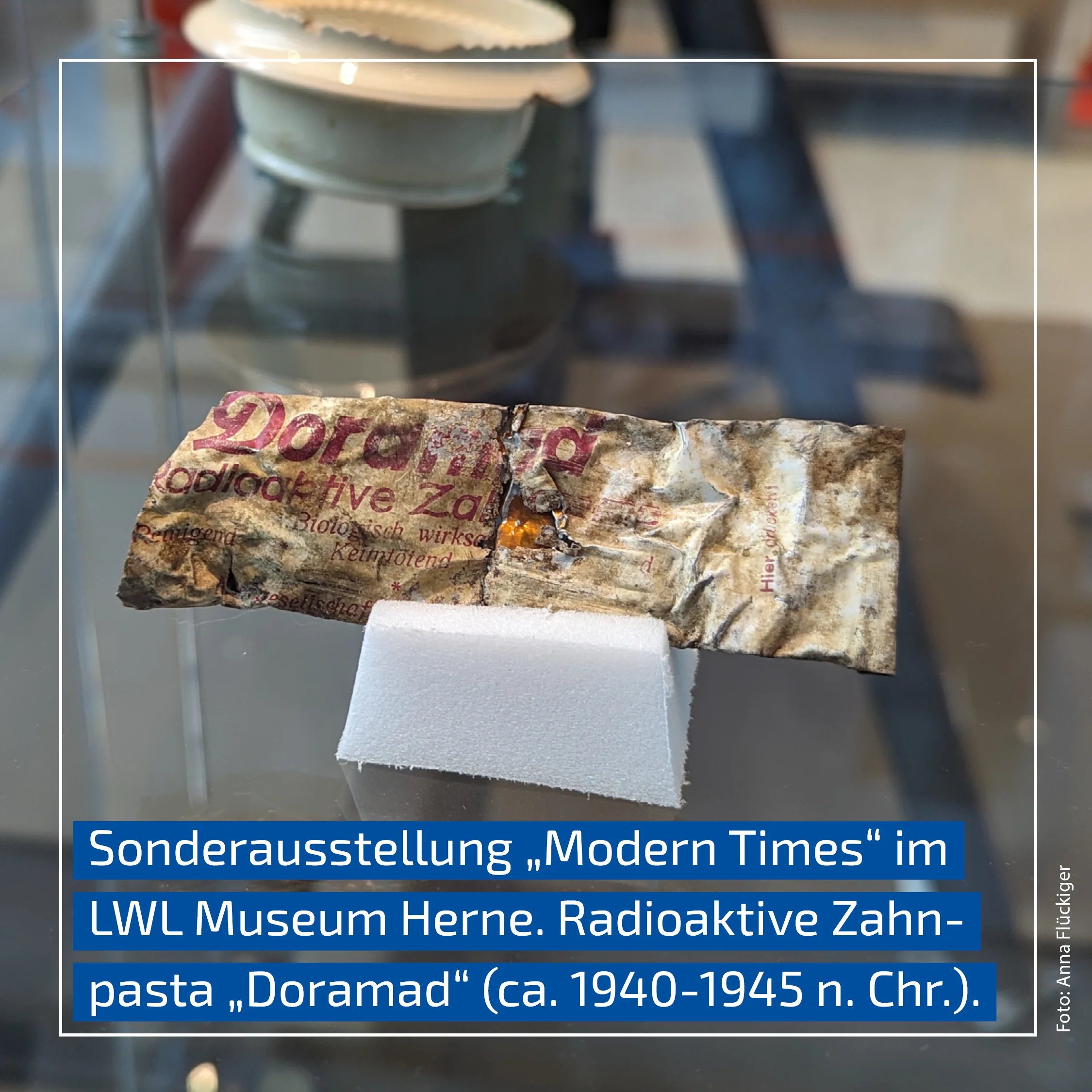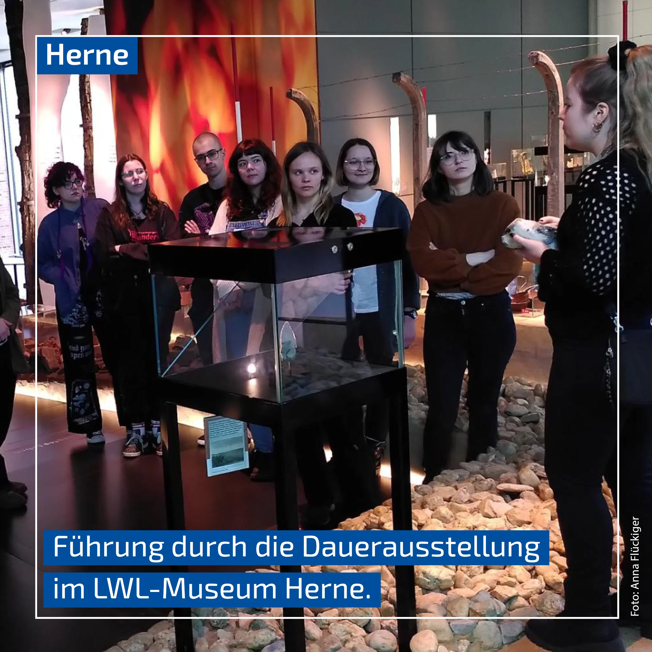Am 03. April 2024 ging es im Rahmen einer Kurzexkursion unter der Leitung von Dr. Anna Flückiger und Valerie Palmowski, M.A., nach Herne, Halle und Chemnitz. Unsere Museums-Tour begann mit einer Begrüßung durch Dr. Doreen Mölders im LWL Museum für Archäologie und Kultur, Westfälisches Landesmuseum Herne. Marina Dessau begleitete uns durch die Dauerausstellung sowie die Sonderausstellung „Modern Times“. Von radioaktiver Zahnpasta bis zum ‚versteinerten Nusskuchen‘ wurde die Beziehung zwischen Menschen und Objekt an vielen Beispielen verdeutlicht.