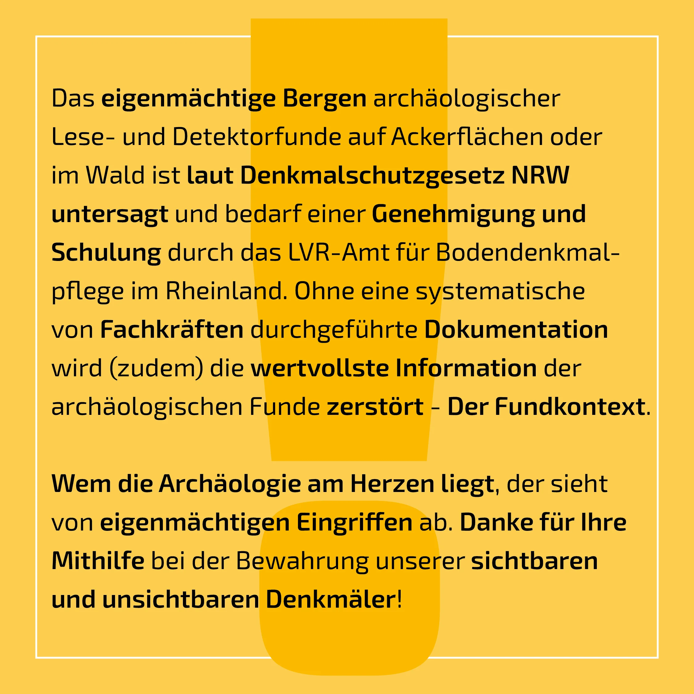 Das eigenmächtige Bergen archäologischer Lese- und Detektorfunde auf Ackerflächen oder im Wald ist laut Denkmalschutzgesetz NRW untersagt und bedarf einer Genehmigung und Schulung durch das LVR-Amt für Bodendenkmalpflege im Rheinland. Außerdem muss der Eigentümer*in der Fläche die Erlaubnis zur Betretung erteilen. Ohne eine systematische von Fachkräften durchgeführte Dokumentation wird (zudem) die wertvollste Information der archäologischen Funde zerstört - Der Fundkontext.